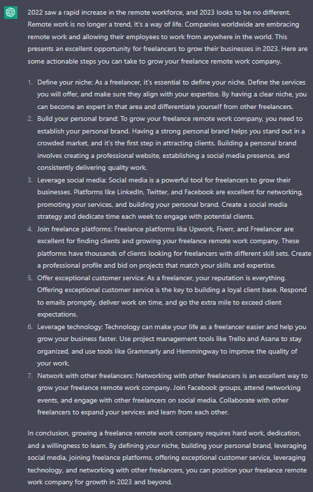 Then, I asked, ‘How to grow a freelance remote work company in 2023’, and it gave the following blog post.