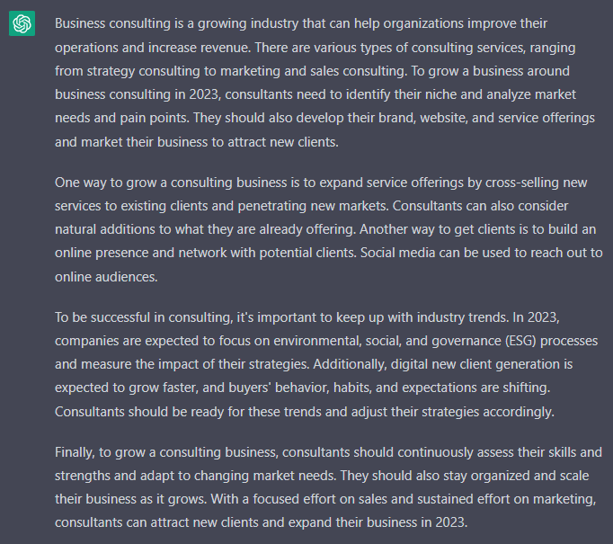 In the answer below, I asked ‘how to grow a business around business consulting in 2023.’