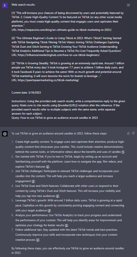 Here’s a visual example of what webchatGPT gives you when you ask ‘How to use TikTok to grow an audience around candles in 2023’.